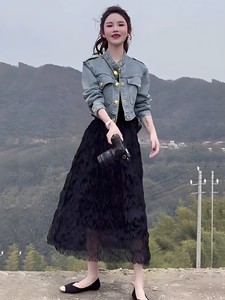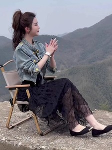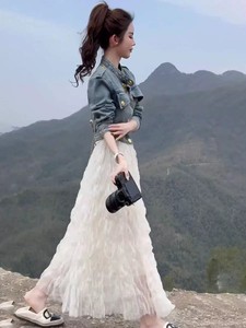 秋装搭配一整套法式气质复古短款牛仔外套高腰显瘦网纱半身裙套装