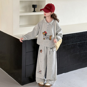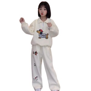 女童秋装腊肠狗卡通立领卫衣套装中大童春秋新款纯色休闲风两件套