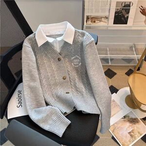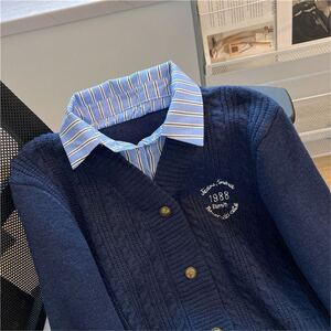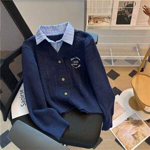 学院两件美式针织衫春秋小众新款设计拼接短款毛衣外套上衣开衫