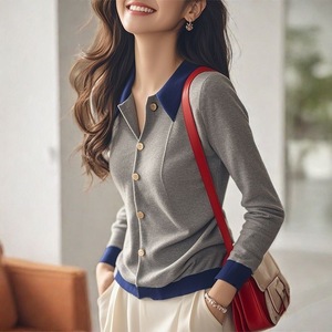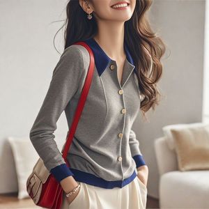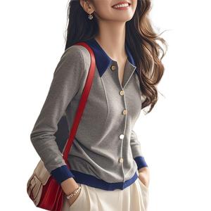 灰色拼接针织衫女2025秋冬新款单排扣长袖打底上衣气质polo领外套