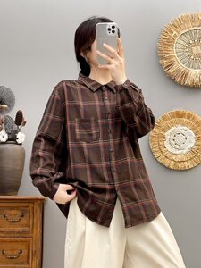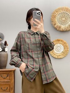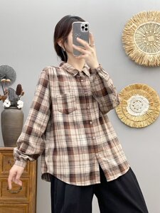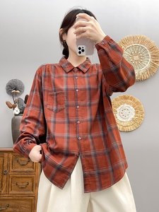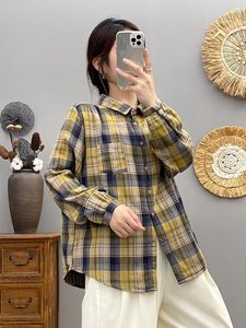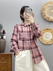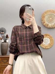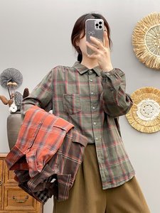 2856文艺棉纱经典大格子长袖衬衫 女2025秋装新款休闲显瘦上衣