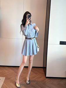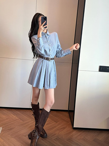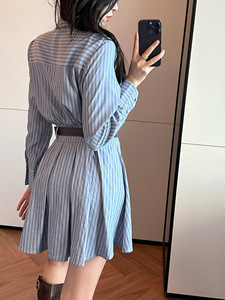 实拍气质腰带竖条纹衬衫连衣裙秋冬内搭打底短裙高腰百褶衬衣裙子