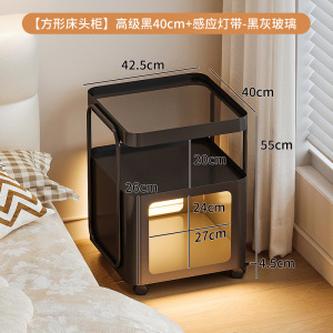 【方形床头柜】轻奢黑40cm+感应灯带-钢化玻璃