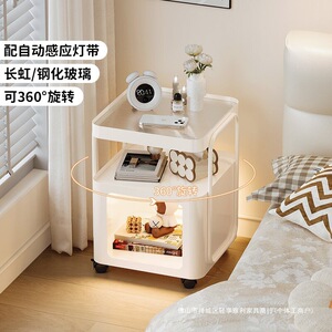 【方形床头柜】奶油白35cm+感应灯带-长虹玻璃