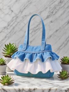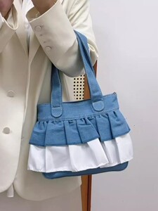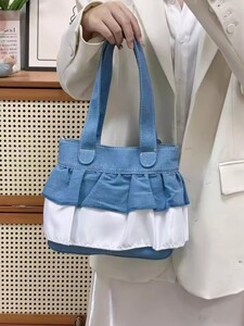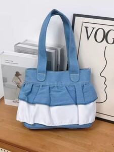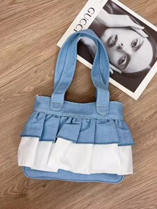 复古牛仔蕾丝拼接单肩腋下包休闲百搭荷叶花边通勤托特包手提包女