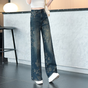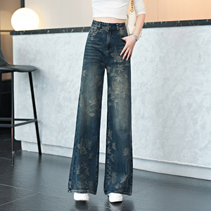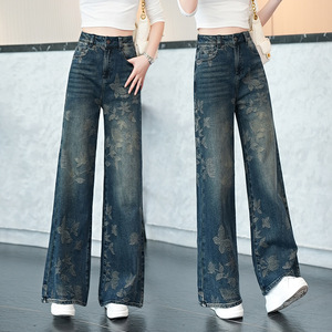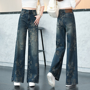 设计感提花阔腿牛仔裤女2025秋季新款气质高腰显瘦宽松休闲直筒裤