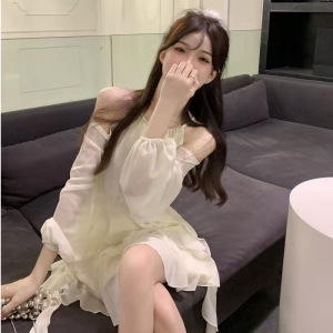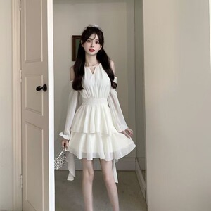 法式2025长袖连衣裙仙女裙秋季仙气收腰显瘦纯欲风短裙荷叶边杏色