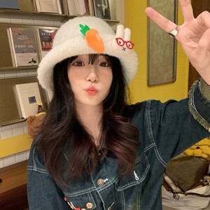 原创卡通兔子胡萝卜毛绒渔夫帽女秋冬保暖可爱盆帽百搭显脸小礼帽