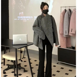 欧美跨境亚马逊灰色毛呢子大衣秋冬韩版赫本风小个子短款毛呢外套