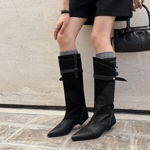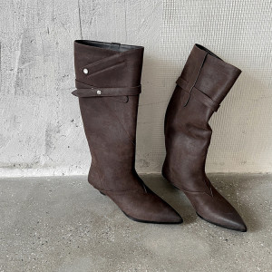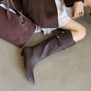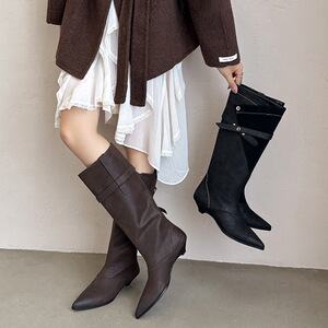 2025秋冬新款棕色巴戈皮尖头铆钉套筒低跟时装靴长筒靴套筒骑士靴
