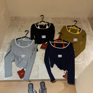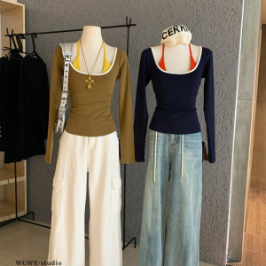 WGWE6974美式复古假两件撞色挂脖修身显瘦辣妹上衣
