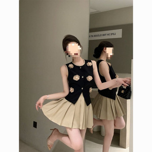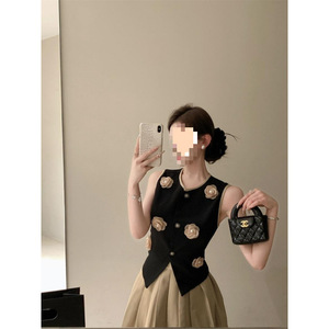 法式小香风无袖马甲背心女夏季修身黑色花朵小众圆领短款气质上衣