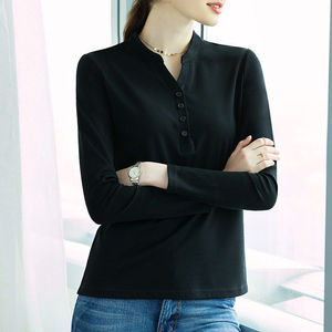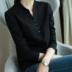 棉质长袖t恤女立领打底衫2025秋季新款韩版时尚V领显瘦遮肚子上衣