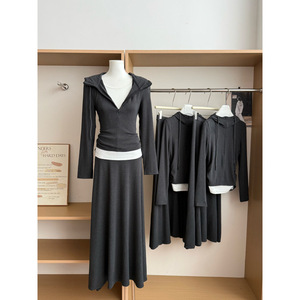 塞纳2025秋季新款绒感拼接连帽上衣垂感半身裙套装女两件套