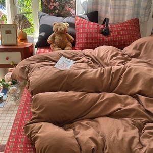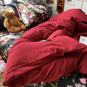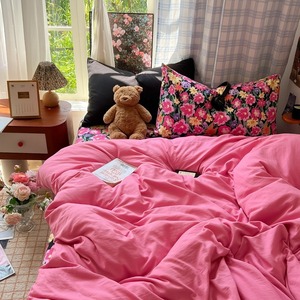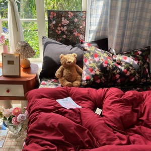 高级感复古红花卉拼色床单床笠款四件套床罩被套宿舍三件套水洗棉