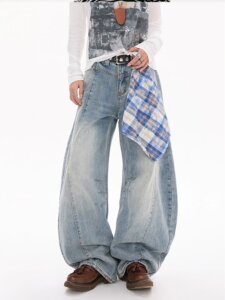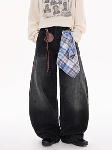 美式复古阔腿弯刀牛仔裤直筒带方巾拖地长裤百搭宽松休闲牛仔裤