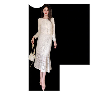 跨境2025秋季气质女神范圆领长袖蕾丝衫上衣+鱼尾裙杏色套装女