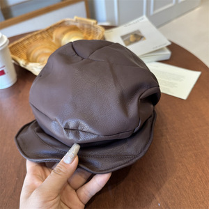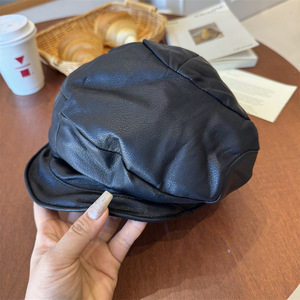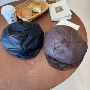 小众设计感不规则褶皱PU贝雷帽子女复古皮质八角帽时尚个性报童帽