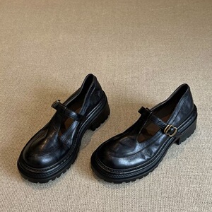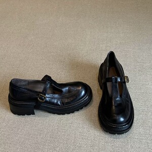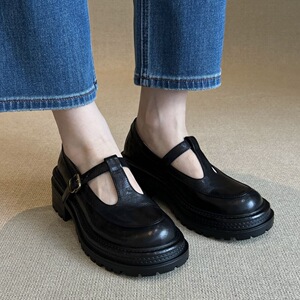 2025秋季新款牛皮版复古厚底小个子增高丁字扣圆头粗跟百搭乐福鞋