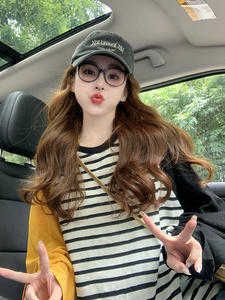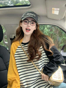 撞色条纹拼接插肩长袖t恤女秋季2025新款设计感美式宽松慵懒上衣