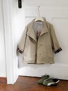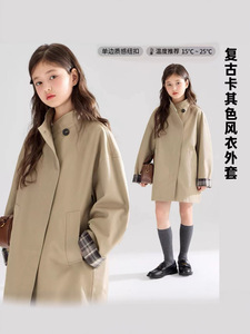 面包仔女童复古格子翻边撞色卡其风衣外套