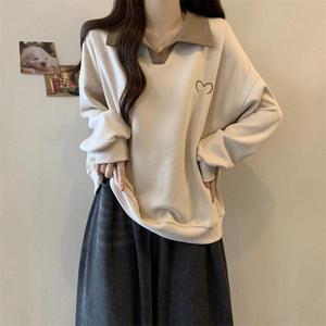 大码女装撞色polo领卫衣女春秋胖mm显瘦宽松设计感慵懒风外套上衣