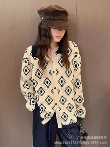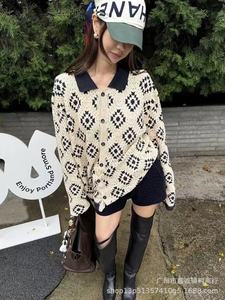 复古时尚设计感小众翻领撞色针织开衫女秋季新款慵懒宽松显瘦上衣