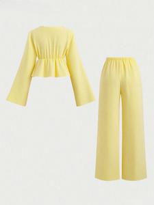 新款舒适高级感条纹宽松系带上衣休闲两件套百搭长袖甜美时尚套装
