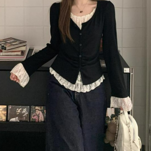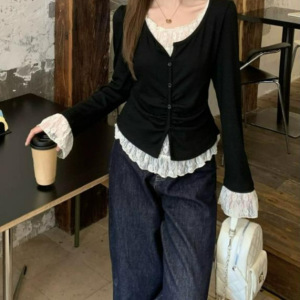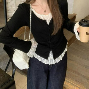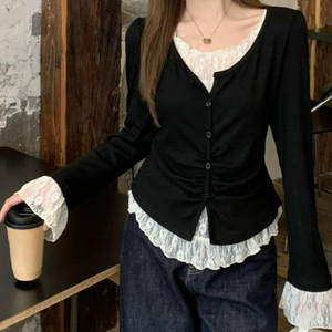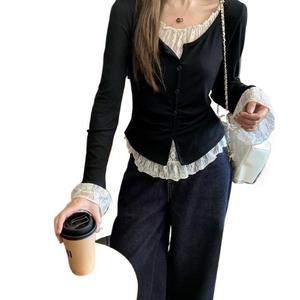 2025秋季显瘦遮肉蕾丝拼接上衣黑色假两件正肩长袖