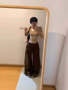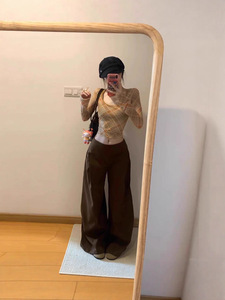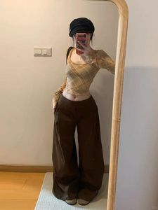 复古格纹u领中袖正肩T恤女秋季小个子修身收腰打底衫辣妹短款上衣