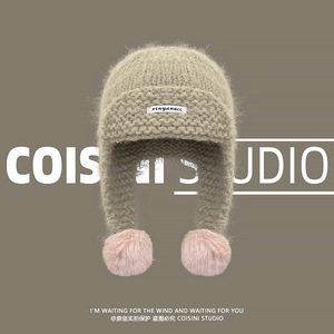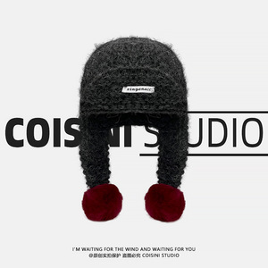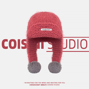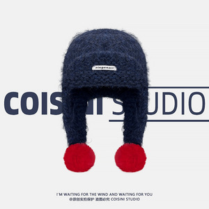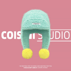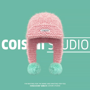 韩版多巴胺撞色针织毛线帽女秋冬加长毛球护耳保暖显脸小雷锋帽潮