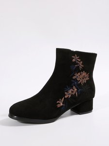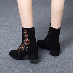 民族风女鞋绒面秋冬季软底短靴女新款绣花马丁靴粗跟磨砂复古单靴