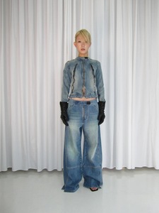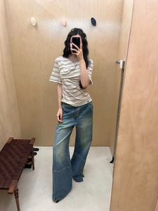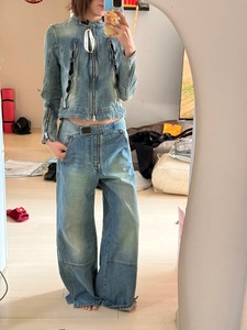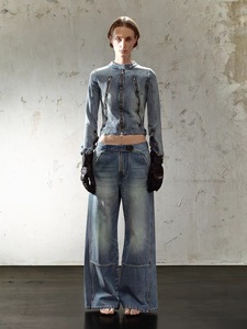 南油女装批发设计师“复古分割做旧”水洗皮标装饰粘扣阔腿牛仔裤