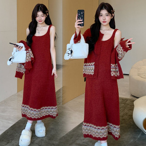 孕妇装2025秋冬新款韩版孕妇设计感牛角扣开衫外套背心裙针织套装