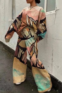 欧美跨境秋冬新款3D印花时尚圆领卫衣运动衫休闲套装女阔腿裤拼色