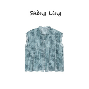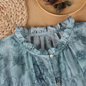 莨麻印花气质蓝休闲花边领木耳边衬衣SL50774