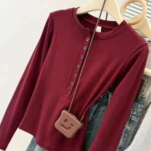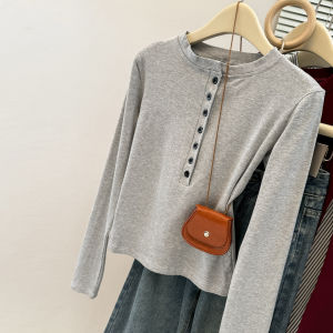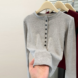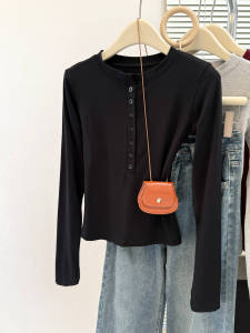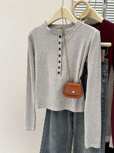 美式实拍纽扣圆领长袖T恤女早秋修身韩版内搭打底衫甜辣妹上衣