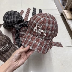 秋冬百搭撞色条纹格子显瘦减龄棒球帽子女卡通蝴蝶结飘带鸭舌帽潮