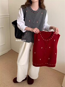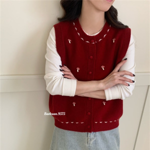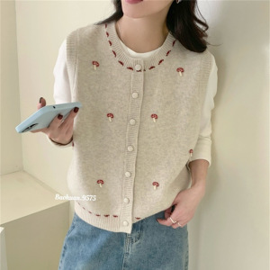 韩系蘑菇刺绣针织开衫背心女2025春秋新款宽松百搭毛衣马甲坎肩潮