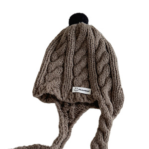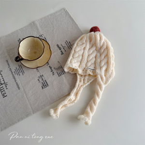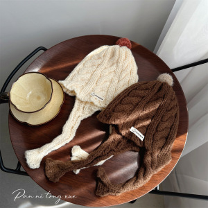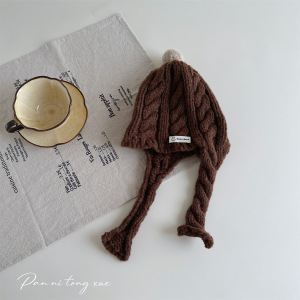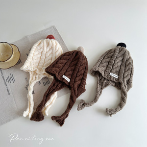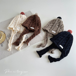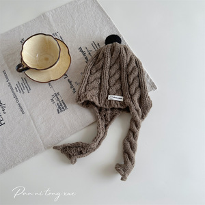 儿童ins简约纯色麻花针织护耳帽男女宝宝毛球笑脸标毛线帽子