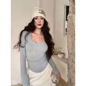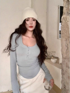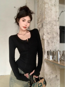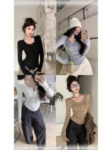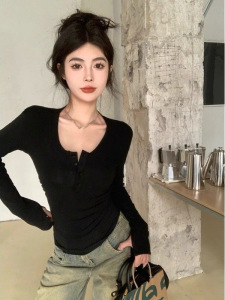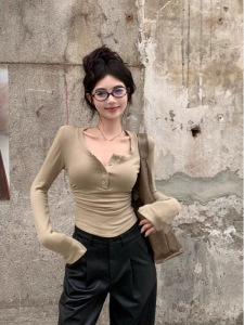 卡其色正肩V领T恤女春秋季棉质内搭长袖打底衫设计感收腰修身上衣