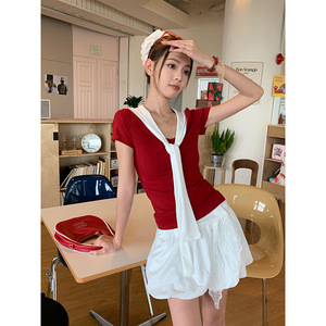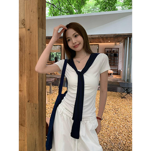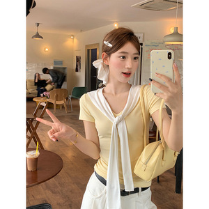 宋正恩鹅黄色V领短袖t恤女夏季韩系修身显瘦短款海军领设计感上衣