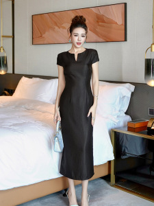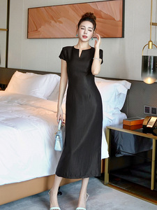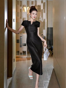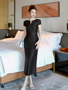 2025夏季新款女装法式V领收腰过膝黑色连衣裙正式场合礼服裙9041