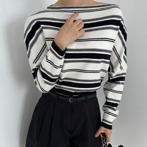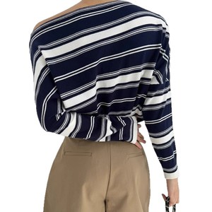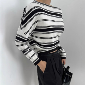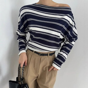 2025早秋新款韩版复古斜领设计条纹气质露肩长袖针织衫女T恤上衣