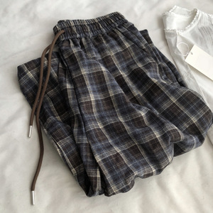 巴恩风复古磨毛格纹高腰休闲阔腿长裤秋季百搭直筒宽松裤女
