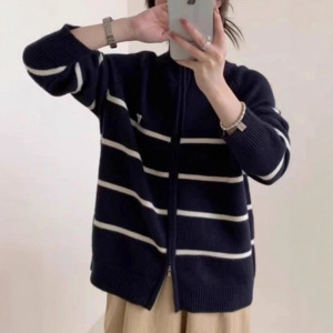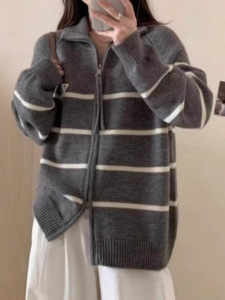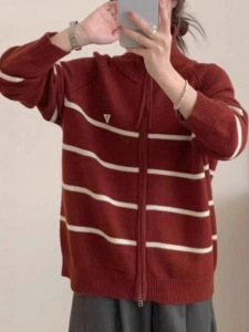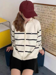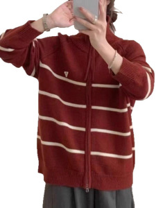 撞色条纹半拉链毛衣女韩版宽松慵懒简约复古风翻领长袖针织衫上衣