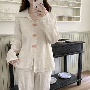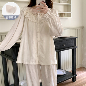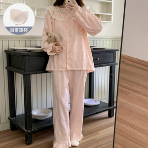 带胸垫睡衣女春秋款可爱蝴蝶结蕾丝边长袖长裤秋冬季可外穿家居服