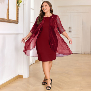 跨境爆款大码女装优雅纯色拼银丝亮闪网纱优雅宴会七分袖连衣裙