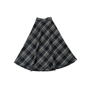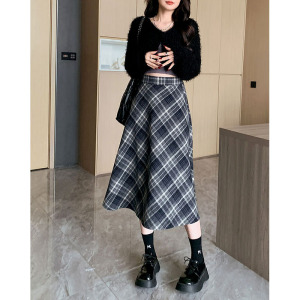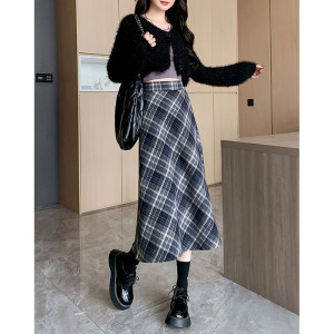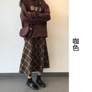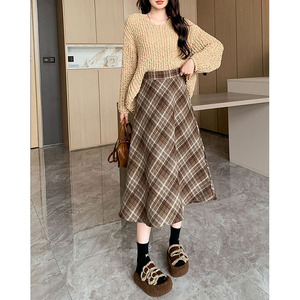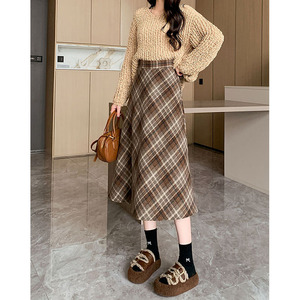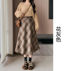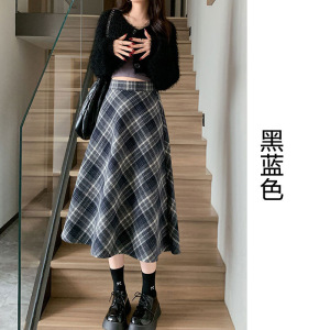 百搭小个子毛呢格子半身裙女秋冬季高腰显瘦a字裙中长款大摆伞裙