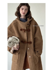 L家 圈圈小熊'复古手工毛线牛角扣绵羊毛中长款连帽大衣外套女冬